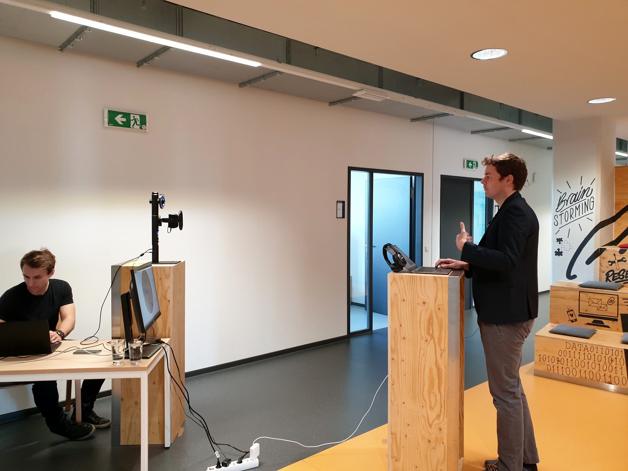 We started on Wednesday with our lecture “Service Management and Service Engineering”, where Prof. Dr. Martin Matzner welcomed the students live in front of our bleachers in our offices at “Auf AEG”. He was supported (from a safe distance) by Emanuel Marx and Sandra Zilker, who relentlessly worked behind the scenes to ensure the smooth operation of the event and to coordinate questions from our students.